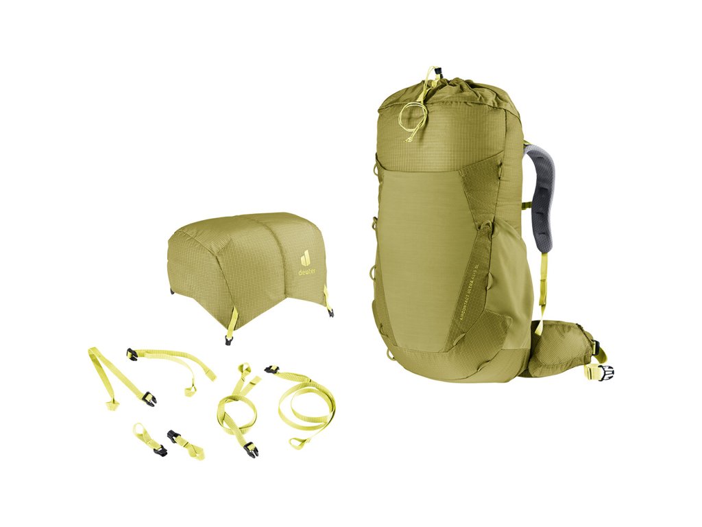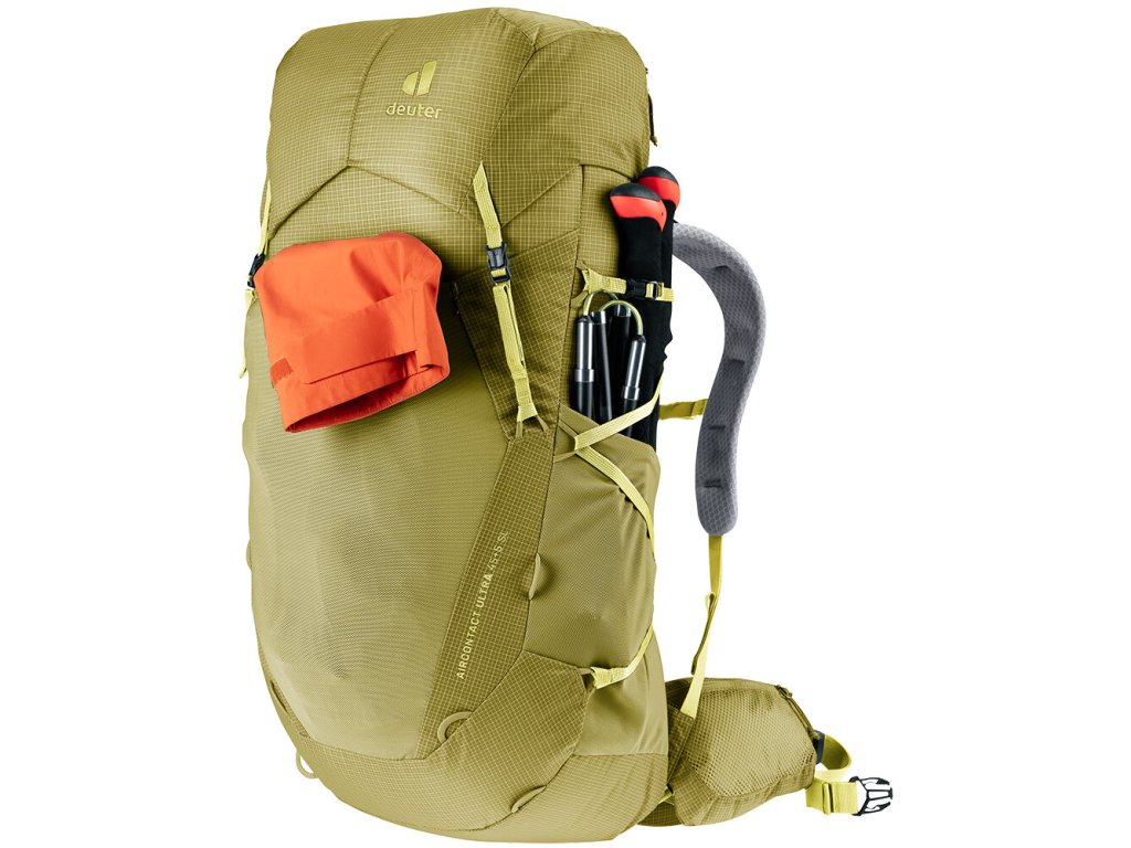 Do batohu Aircontact Ultra 45+5 SL se vleze vše potřebné. Hlavní komora je dostupná shora pod odnímatelným víkem s kapsou, pomocí něhož si můžete prakticky zvětšit objem batohu až o 5 litrů, což ocení hlavně dámy, kterým jedny kraťasy prostě nestačí. Sejmutím víka rovněž snížíte váhu batohu. Pomocí stahovací šňůrky a uzávěru na druky pak hlavní komoru uzavřete. Uvnitř se nachází kapsa na hydrovak nebo mokré prádlo. Dvě lehké síťované kapsy, třeba na lahev s vodou, najdete na bocích, jednu strečovou vepředu, třeba na nepromokavou bundu. Dvě kapsy na zip jsou na bederním pásu. Součástí batohu jsou praktická poutka a variabilní popruhy na upevnění GPS, mapy, karimatky nebo stanu.