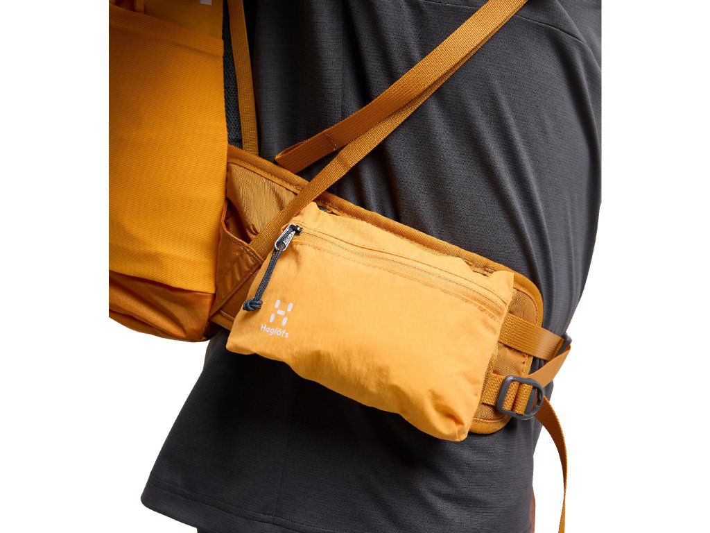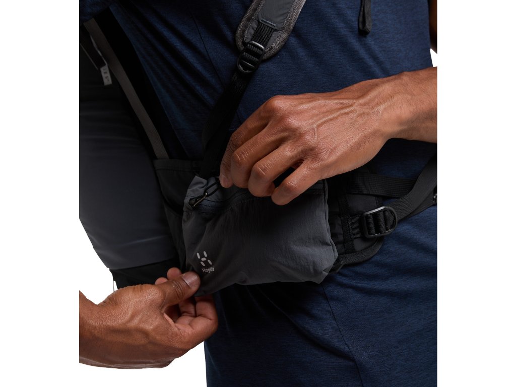 - elastická kapsa na levém ramenním popruhu s Hydroflask lahví 360ml, na pravém popruhu je zipová kapsa na mobil