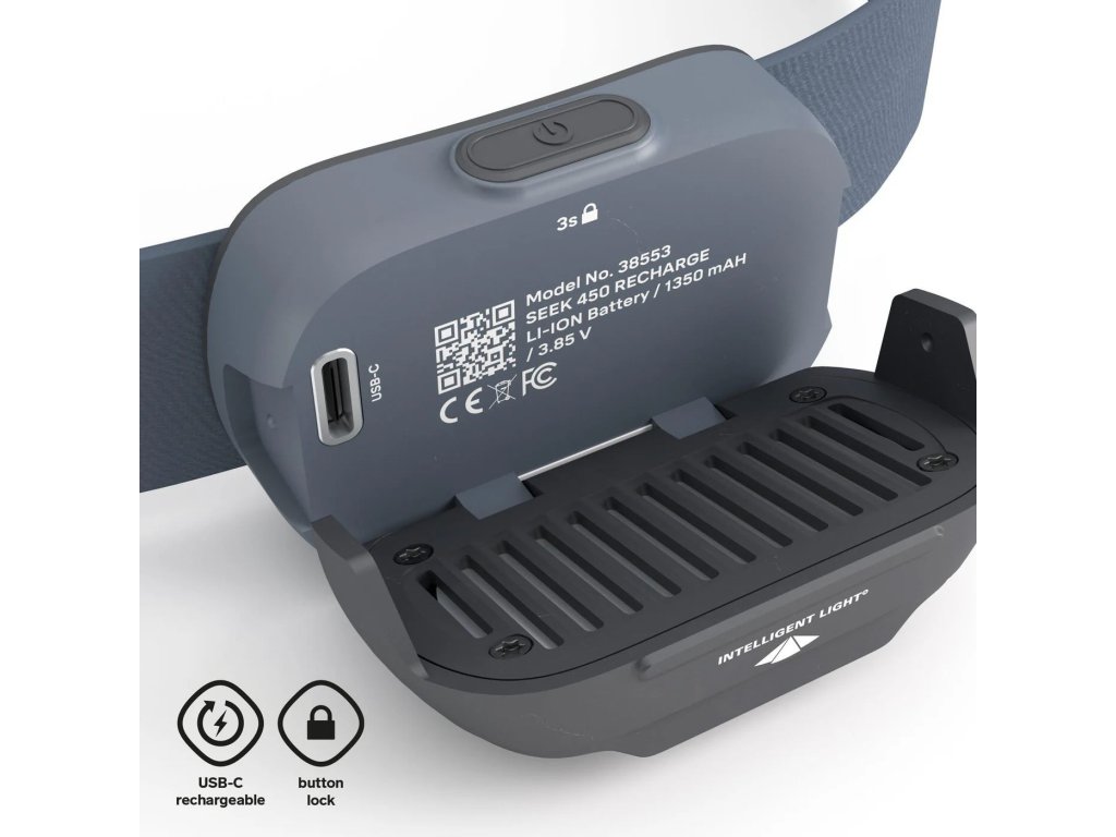 SEEK 450 s integrovanou dobíjecí Li-Ion baterií a 450 lumeny, je nejvýkonnějším modelem řady kompaktních čelovek Seek. Technologie Silva Intelligent Light - dvě bílé diody díky optice čoček rovnoměrně prosvítí prostor do dálky i stran, červená dioda pro tlumené, okolí nerušící svícení. Indikace stavu baterie formou zelené a červené diody, svítí-li po vypnutí čelovky zelená dioda, je stav baterie nad 50%, červená dioda indikuje kapacitu baterie pod 50%. Ve výklopné části svítilny je zabudovaný pasivní hliníkový chladič. Praktický zámek tlačítka proti nechtěnému zapnutí čelovky. Komfortní elastická čelenka je 25 mm široká a z vnitřní strany má silikonový střed pro lepší stabilitu na hlavě, o nastavení obvodu se starají dvě rychlonastavitelné spony. Seek 450 odolává tryskající vodě ze všech stran - IPX5. Jako hlavní materiál byly použity recyklované plasty. Celková hmotnost čelovky je 70 g.
