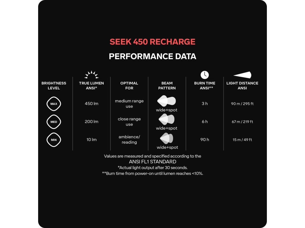 SEEK 450 s integrovanou dobíjecí Li-Ion baterií a 450 lumeny, je nejvýkonnějším modelem řady kompaktních čelovek Seek. Technologie Silva Intelligent Light - dvě bílé diody díky optice čoček rovnoměrně prosvítí prostor do dálky i stran, červená dioda pro tlumené, okolí nerušící svícení. Indikace stavu baterie formou zelené a červené diody, svítí-li po vypnutí čelovky zelená dioda, je stav baterie nad 50%, červená dioda indikuje kapacitu baterie pod 50%. Ve výklopné části svítilny je zabudovaný pasivní hliníkový chladič. Praktický zámek tlačítka proti nechtěnému zapnutí čelovky. Komfortní elastická čelenka je 25 mm široká a z vnitřní strany má silikonový střed pro lepší stabilitu na hlavě, o nastavení obvodu se starají dvě rychlonastavitelné spony. Seek 450 odolává tryskající vodě ze všech stran - IPX5. Jako hlavní materiál byly použity recyklované plasty. Celková hmotnost čelovky je 70 g.