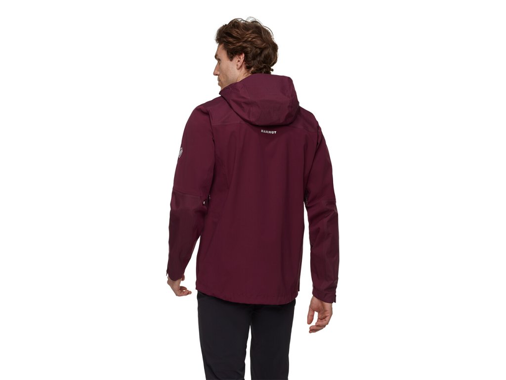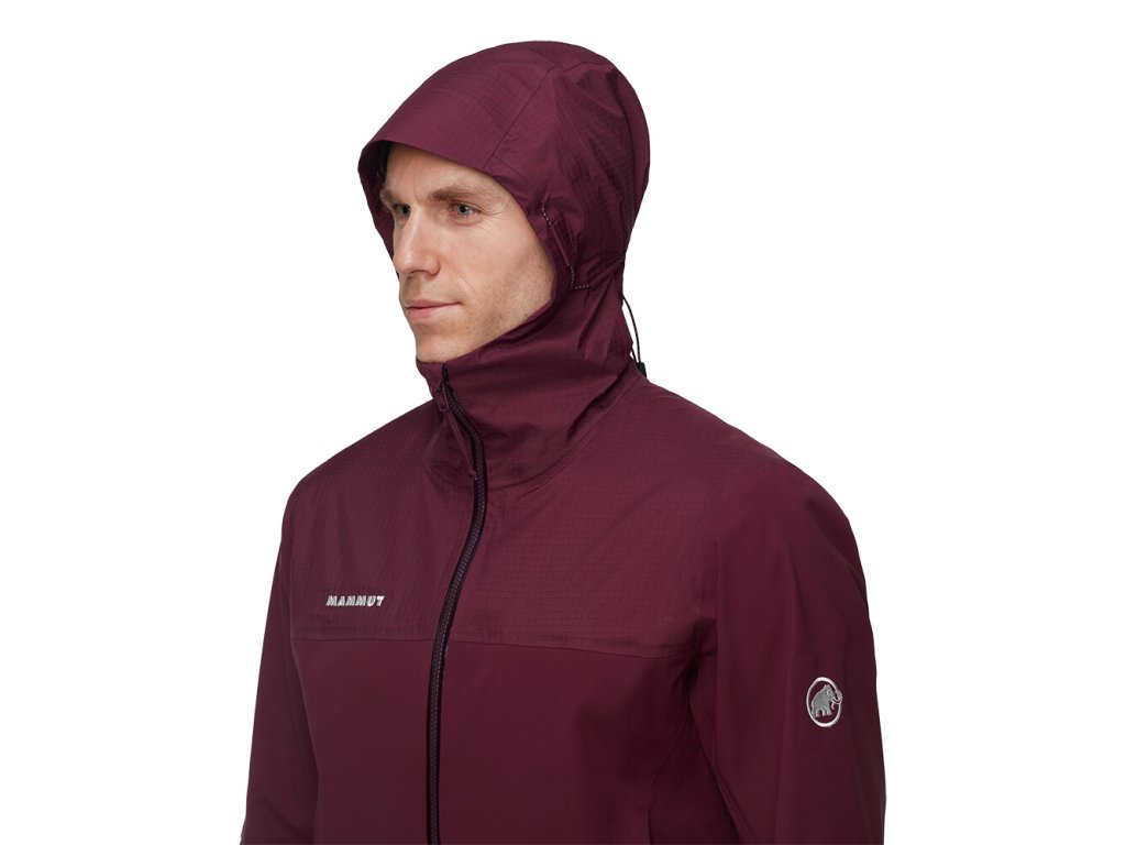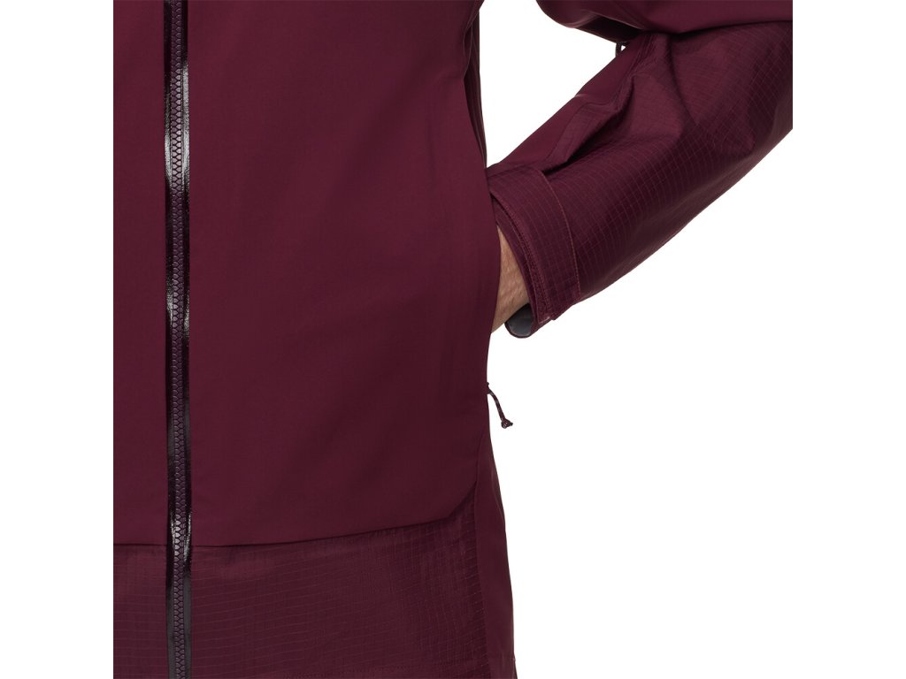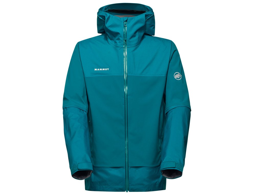 Bunda je vyrobena z třívrstvého materiálu Mammut DRY Tour. Díky tomu je nepromokavá, prodyšná a větruodolná. Zipová ventilace v podpaží umožní regulaci teploty při zvýšené fyzické aktivitě. Nastavitelná kapuce skvěle sedne. Předtvarované rukávy jsou doplněny o praktické nastavitelné manžety. Dvě zipové kapsy uchovají potřebné drobnosti. Vnitřní kapsa disponuje většími rozměry. Švy na ramenou jsou umístěny tak, aby nepřekážely při použití s batohem. Spodní lem je nastavitelný. Samozřejmostí je nepromokavý zip.