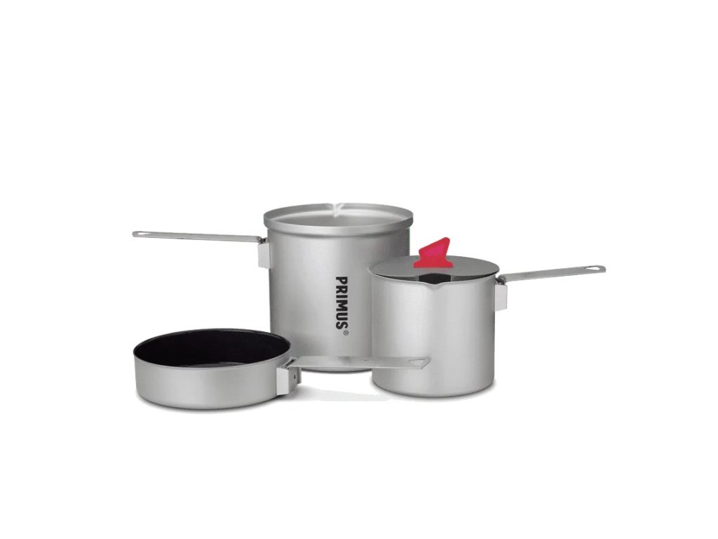 PRIMUS Essential Trek Pot Set obsahuje dva hrnce o objemu 0,6 l a 1,0 L z anodizovaného hliníku pro efektivní a rychlé stravování v přírodě. Menší je vybaven plastovou poklicí s cedníkem, u většího hrnce je poklice s keramickým nepřilnavým povrchem, použitelná jako minimalistická pánev. Mírně silnější dno obou hrnců má spirálovitý vzor, který zajišťuje optimální přenos tepla a přilnavost k vařiči. Součástí balení jsou tři odnímatelné rukojetě, které lze zaaretovat ve dvou polohách pro bezpečnou manipulaci a přepravu. Oba hrnce jsou sbalitelné do samostaného vaku. Pro úsporu objemu, lze menší hrnec vložit do většího.