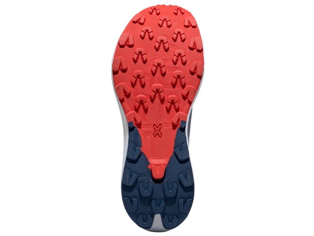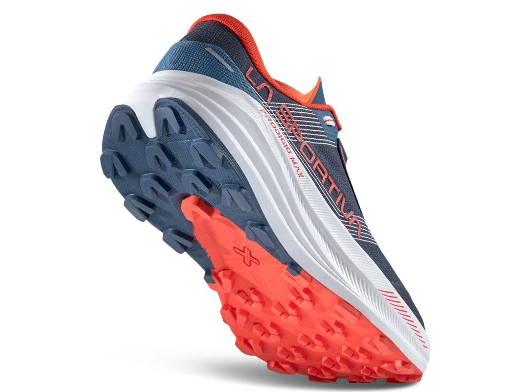 Základem boty je inovativní mezipodešev XFlow™ Endurance, která kombinuje vysokou úroveň tlumení, odolnost a stabilitu. Zvýšené tlumení (37 mm pata / 31 mm špička) chrání nohy před únavou a nárazy, a to i při běhu na tvrdém povrchu nebo v kamenitém terénu. Stabilní platforma (cca 90 mm pata/ 115 mm špička) vám zaručí jistotu došlapu i v technickém terénu. Podrážka FriXion® Red spojuje lepivou gumu v přední části pro jistotu na technických pasážích a odolnější směs v patě pro dlouhou životnost. 4mm špunty poskytují dostatečný záběr na sypkém podkladu, přitom zůstávají komfortní i na tvrdších cestách. Díky této kombinaci se Prodigio Max hodí jak do hor, tak na lesní a šotolinové cesty.