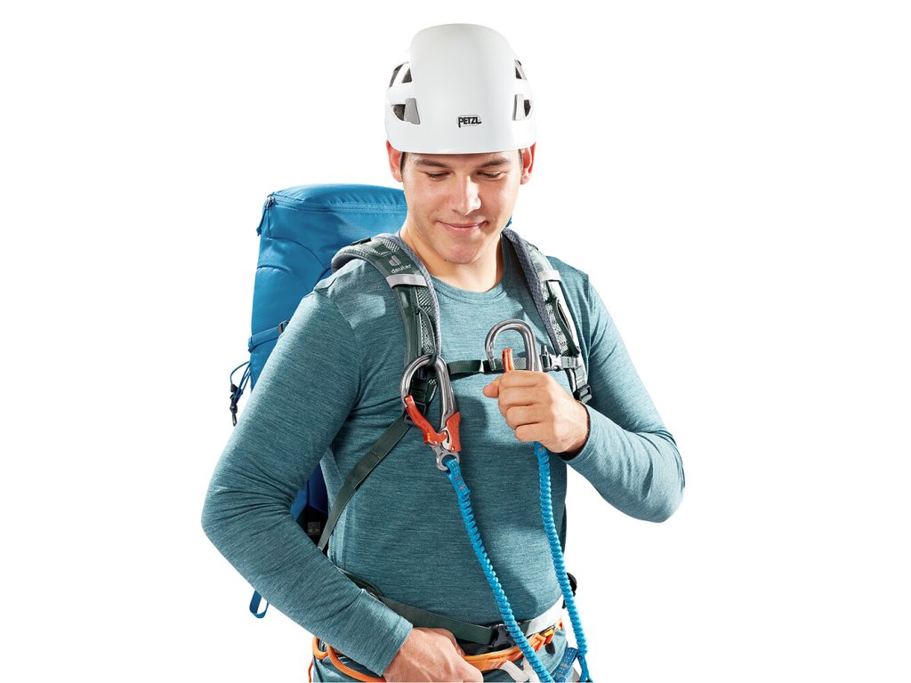 - smyčky na ruční karabiny pro via ferratové lezení uchycené na ramenních popruzích
