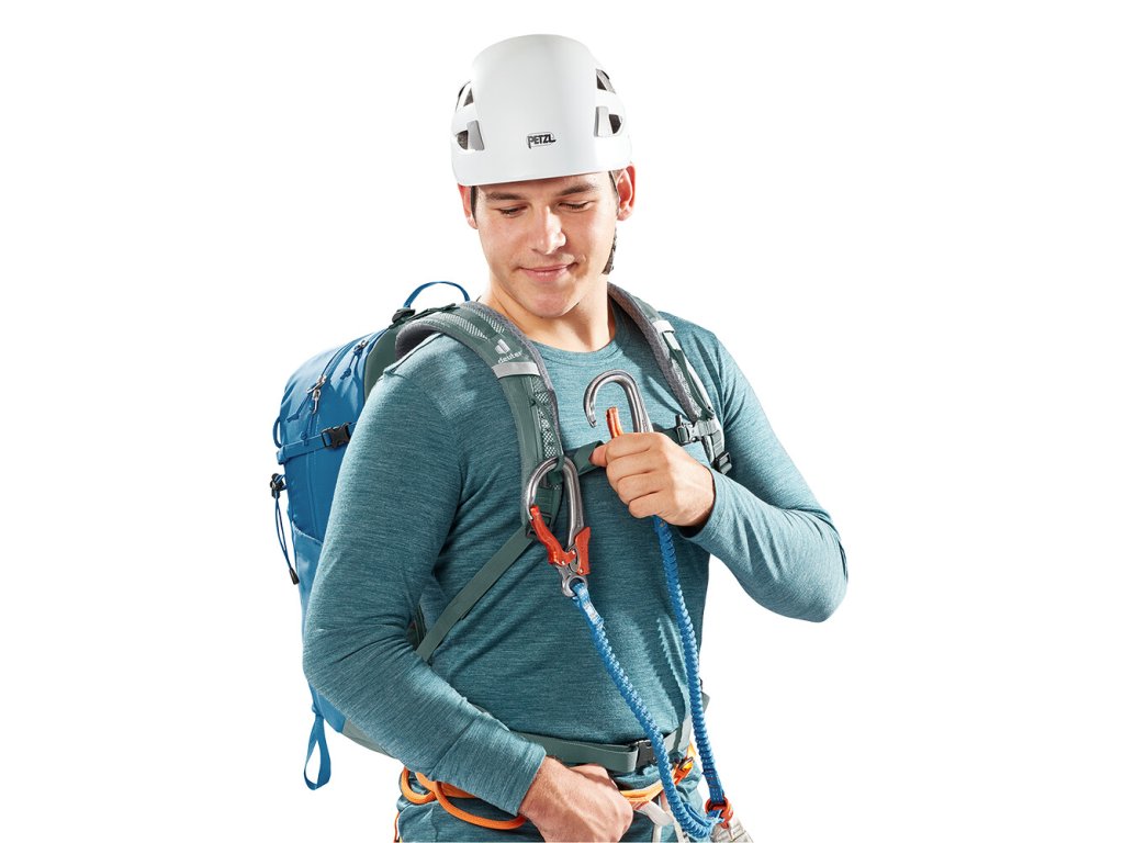 - smyčky na ruční karabiny pro via ferratové lezení uchycené na ramenních popruzích