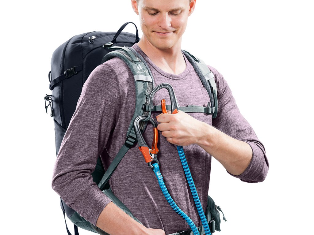 Krásný batoh pro ferratové lezení, to je mazlík od deuteru, Trail Pro 33 . Oceníte jej především pro jeho dobrou stabilitu, skvěle totiž sedí na zádech díky ověřenému zádovému systému Airstripes. Tento systém stojí na flexibilním rámu Delrin® ve tvaru U, který rovnoměrně rozkládá váhu. Dva pruhy tvarované pěny s prodyšnou síťovinou se minimálně dotýkají zad a umožňují tak maximální odvětrávání díky komínovému efektu. V součinnosti s pohyblivými perforovanými ramenními popruhy, nastavitelným bederním pásem a hrudním popruhem vám batoh Trail Pro 33 přilne na záda, jako by byl jejich součástí a přesto budete v suchu a pohodlí i při rychlém postupu.