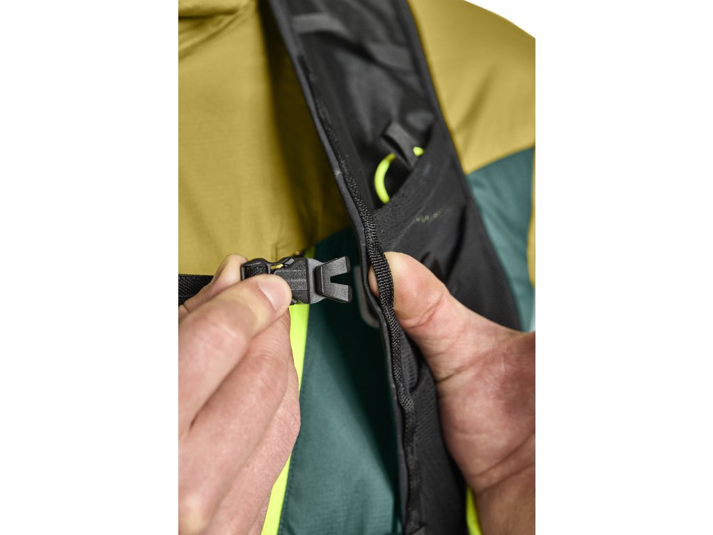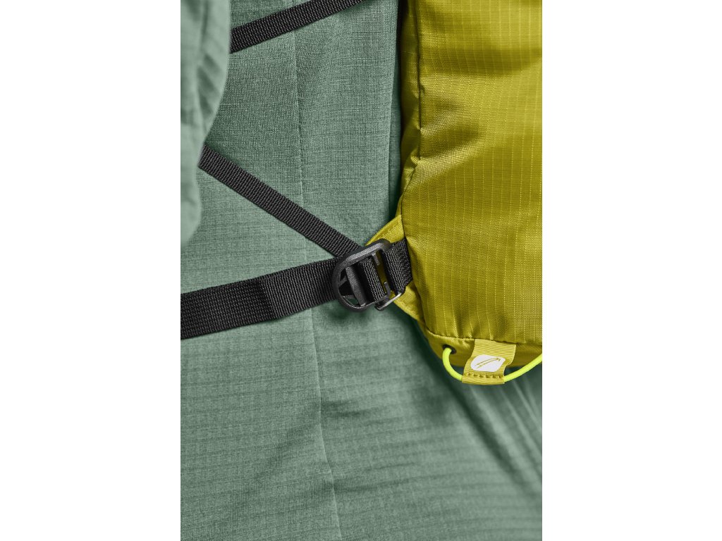 Batoh má ergonomický střih, který obepne tvoje tělo a sedí pevně na zádech. Pro ještě lepší posazení těžiště ještě blíž k zádům můžeš batoh zkomprimovat a to pomocí jeho stažení skrze ramenní popruh. Tohle lze jednoduše provést i s batohem na zádech. Odnímatelný bederní pás, a rovněž odnímatelný hrudní popruh, zaručují obepnutí těla i při velkém zatížení.